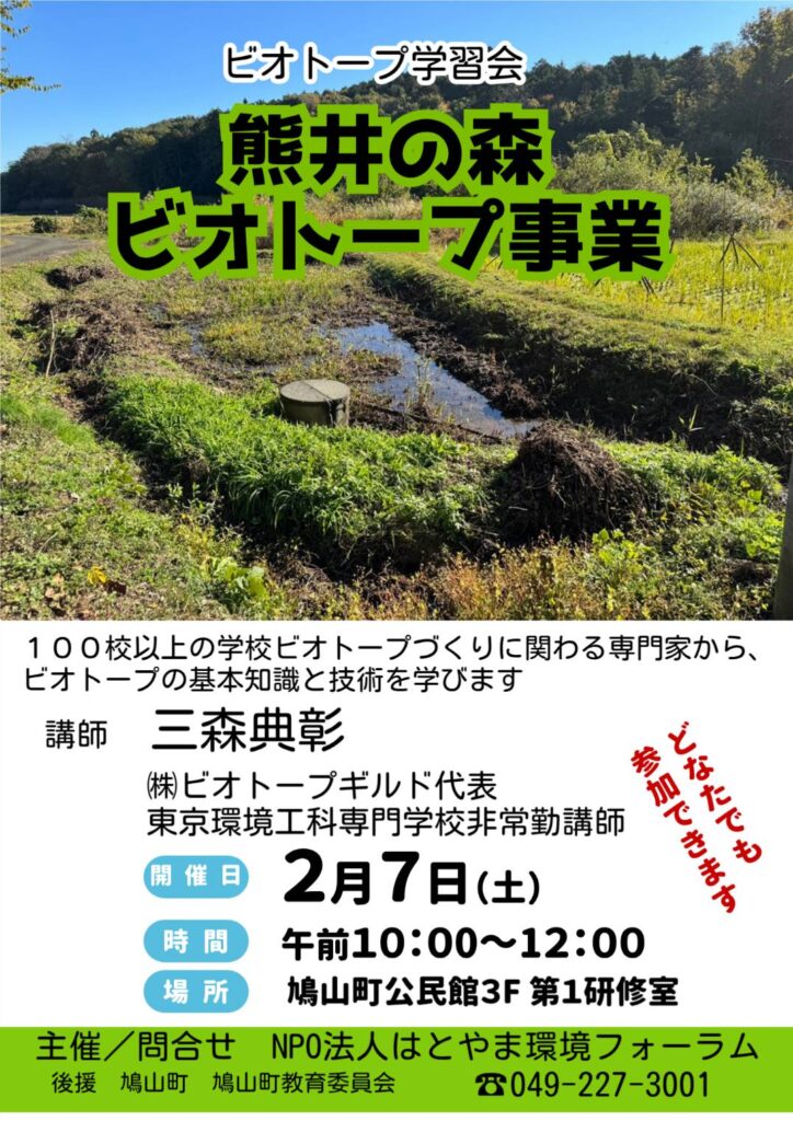 【活動予告】ビオトープ学習会2/7(土) WebTeam 2026年1月11日 お知らせ 0 コメント 冬水田んぼビオトープづくり学習会を開催します 昨年から、熊井の森の石場沼下谷津でビオトープ事業を始めました。ビオトープ1号地(189㎡)は武州・入間川プロジェクト活動助成を受け、隣接する2号地(571㎡)は、埼玉県みどりの活動支援補助事業の交付を受けることが出来ました。これまでヨシや外来植物が生え繁り水面の見えていなかった2カ所を、農薬の影響を軽減し、年間を通して水が張っている「冬水田んぼ」に再生し、昆虫や水生生物の生息に適した環境を創出するのが目的です。 合わせて、石場沼用水路に落下したカエルの救出のために、用水路内に40本の脱出装置を設置し、数10年以上、ヨシに覆われていた谷津田休耕田の一部をハト麦畑に再生する事業にも取り組みます。 学習会はビオトープの基礎知識と技術を学べる好の機会です。ぜひお越しください。 投稿ナビゲーション 前 前の投稿: 【活動報告】12/21忘年会開催次 次の投稿: 【PR】埼玉県HPに掲載されました! コメントを残す コメントをキャンセルメールアドレスが公開されることはありません。 ※ が付いている欄は必須項目ですコメント ※ 名前 ※ メール ※ サイト Δ