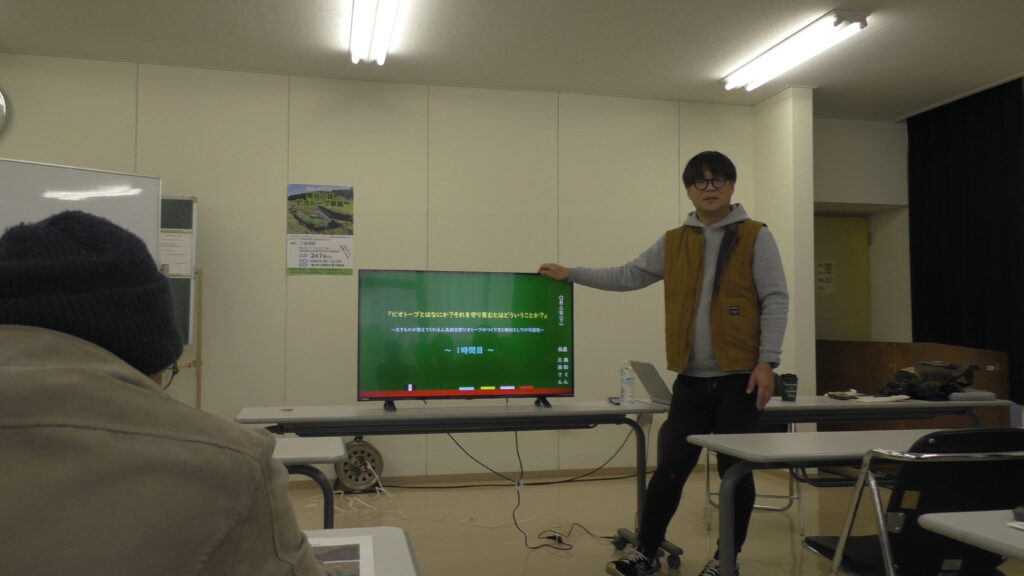 2月7日、鳩山町中央公民館研修室で開催。参加者は12人。ビオトープとは何か、守り育むとは何か、生きものの名前と体のつくりと生態との関係とは何かを、三森典彰さんから教わりました。ビオトープとは「人と生物が我慢したりしないで共に生きれる場所」のことで、生きものを特定してその保護だけを目的にするのはビオトープではない、との講義は目からウロコ。ビオトープの説明をメダカとトンボの体の形から具体的に分かりやすく説明していただけたのも新鮮で、クイズあり、お絵かきありの面白く為になる授業で、「これで無料はすごい!」の声もありました。