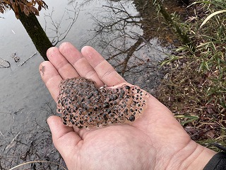 3月はちょうどアカガエルの産卵シーズンです。アカガエルは熊井の森に暮らす生きものたちの重要な餌資源になっていて、石場沼の上の休耕田(湿地)でもよく見かけました。しかし昨年春には湿地水量が激減していて、卵はほとんど見かけられなかったのが気がかりです。