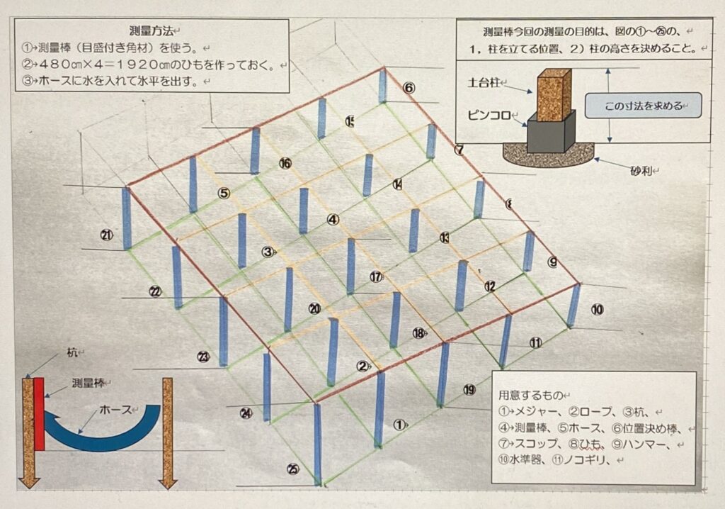 前回、ウッドデッキの土台についての測量を行いました。これからは木材による建設作業に入りますので、人手が多いに越したことはありません。皆様のご協力を期待しております。(井田)